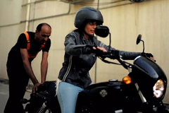 在沙特東部省胡拜爾saso辦理的哈雷戴維森經(jīng)銷商店,saso驗貨一名女子在教練的協(xié)助下騎上這輛殿堂級的電單車。