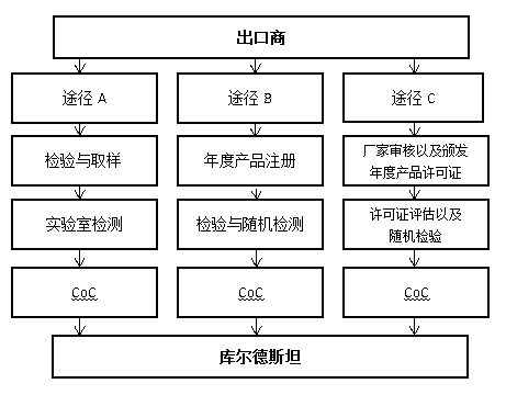 根據(jù)途徑 A,即將裝運(yùn)的管制產(chǎn)品必須經(jīng)過(guò)合規(guī)驗(yàn)證及物理檢驗(yàn),以證明符合庫(kù)爾德斯坦相關(guān)標(biāo)準(zhǔn)及必需的要求。 認(rèn)證流程如下: