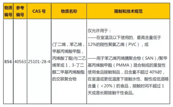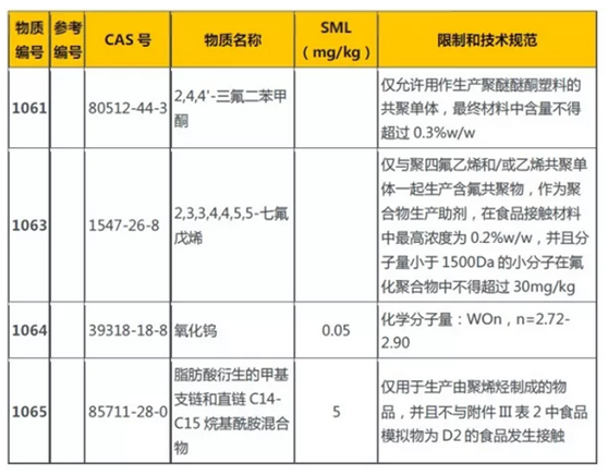 2018年1月19日,歐盟官方公報(OJ)發(fā)布與食品接觸的塑料制品法規(guī)(EU)10/2011的修訂法規(guī)(EU) 2018/79。歐盟食品級塑料法規(guī)從(EU)10/ 2011發(fā)布以來,已歷經9次修訂。 (EU)2018/79作為第9次修訂, 更新了(EU)2011/10附錄I的授權清單, 新增了新增2,4,4'-三氟二苯甲酮、2,3,3,4,4,5,5-七氟戊烯、氧化鎢、脂肪酸衍生的甲基支鏈和直鏈C14-C15烷基酰胺混合物等4項授權物質,并擴大了(丁二烯,苯乙烯,甲基丙烯酸甲酯,丙烯酸丁酯)與二乙烯苯或1,3-丁二醇二甲基丙烯酸酯的交聯聚合物的使用范圍。