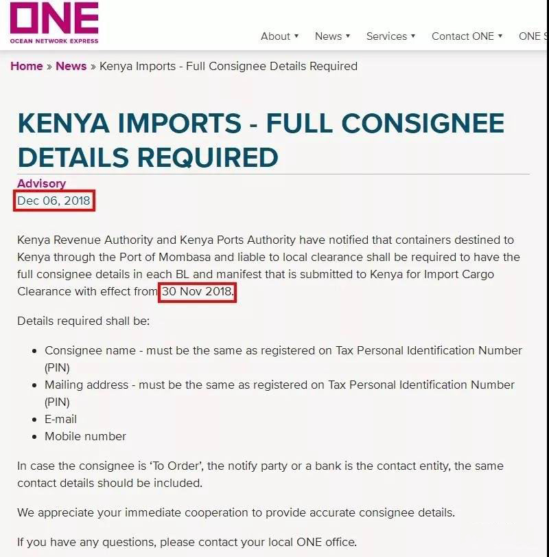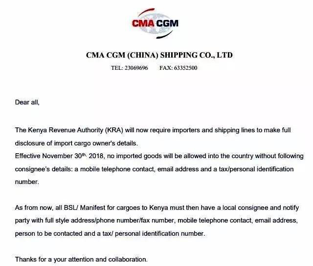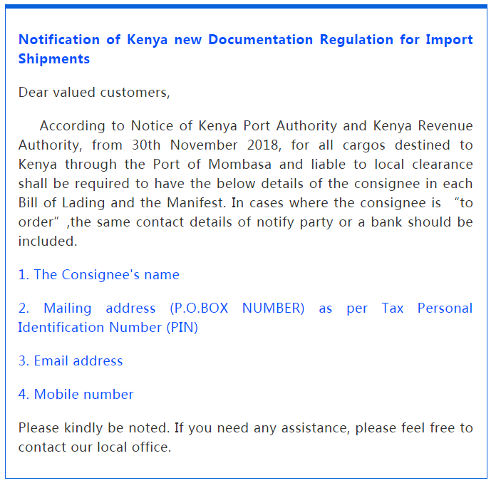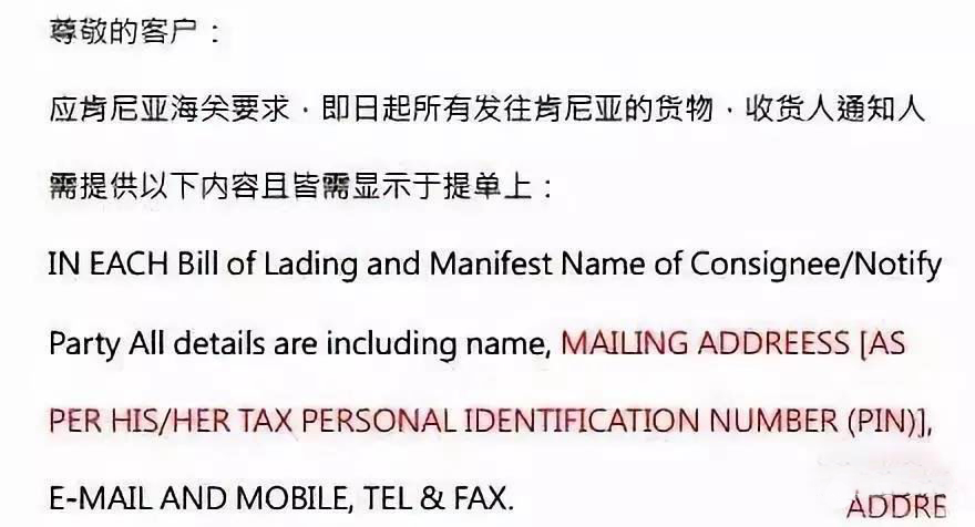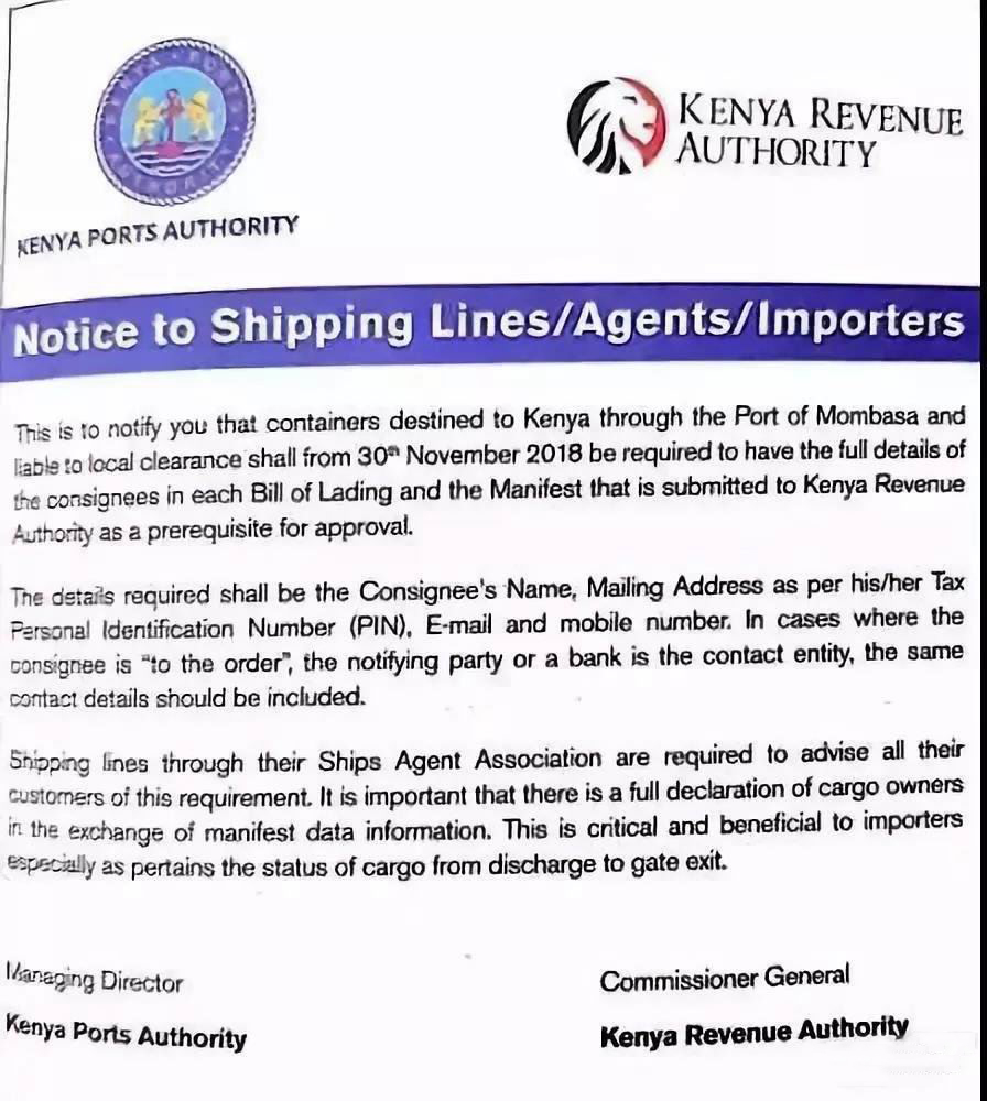從2018年11月30日起,所有運往肯尼亞港口的貨物,在提單收貨人、通知人一欄,必須完整填寫以下信息: