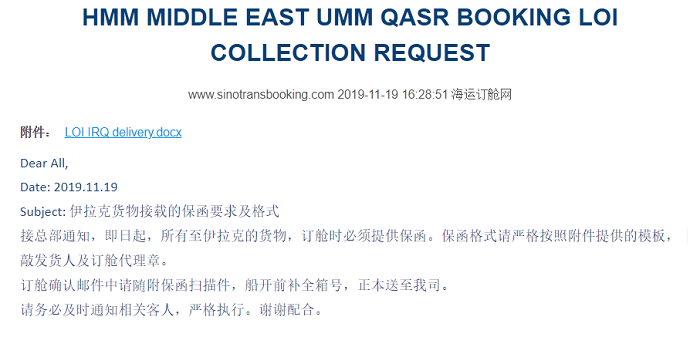 11月19日起,所有運至伊拉克的貨物,訂艙時必須提供保函。保函格式按照船公司提供的模板,敲發(fā)貨人及訂艙代理章。