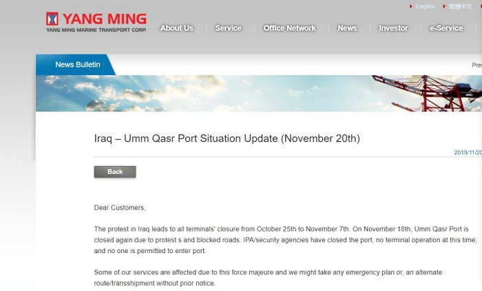 半個月前,運去哪為大家報道了伊拉克國內(nèi)示威活動導(dǎo)致烏姆蓋斯爾港(Umm Qasr)封閉(參考《伊拉克港口封閉!出貨請留神!》),該港口曾于10月29日至11月9日被封鎖,11月7日至9日短暫恢復(fù)運營。