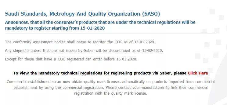 2020年1月15日起,出口沙特所有管制產(chǎn)品強(qiáng)制通過(guò)SABER注冊(cè)