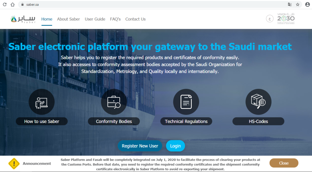 Announcement : Saber Platform and Fasah will be completely integrated on July 1, 2020 to facilitate the process of clearing your products at the Customs Ports. Before that date, you need to register the required conformity certificates and the shipment conformity certificate electronically in Saber Platform to avoid re-exporting your shipment.