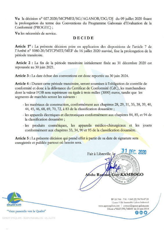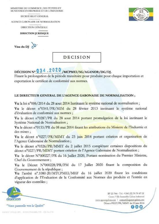 近日,加蓬標準化機構(gòu) AGANOR (Agence Gabonaise de Normalisation) 再次發(fā)布了最新公告,為了能促進更多人理解并更好地執(zhí)行該方案,決定將新法令執(zhí)行過渡期再推遲至2021年6月30日。