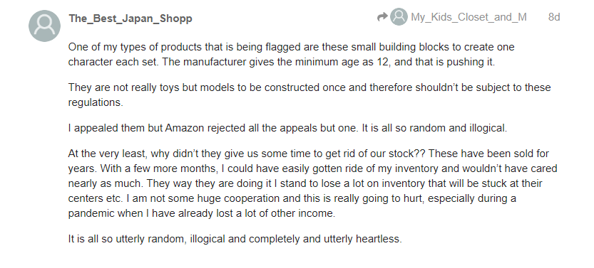 其中一位賣家稱,因產(chǎn)品合規(guī)性調(diào)查,店鋪已經(jīng)有幾百個(gè)listing被亞馬遜下架或禁售,而平臺給出的原因?yàn)椋簺]有詳情描述,侵犯專利或外觀設(shè)計(jì)以及具有安全隱患??善婀种幘驮谟?,這些玩具均出自大型玩具品牌,正規(guī)廠家生產(chǎn),怎么會違規(guī)呢?