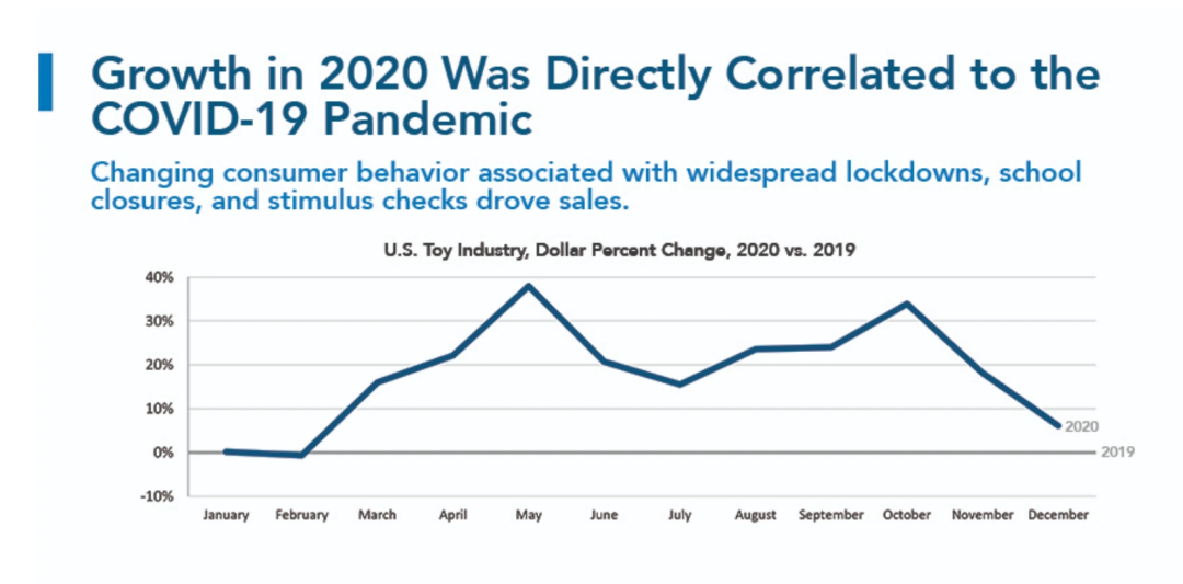 2020年美國玩具銷量大增歸因于學(xué)校停課、居家隔離和消費(fèi)者的線上購物消費(fèi)行為,因此家庭支出從其他類型的娛樂活動紛紛轉(zhuǎn)向玩具。
