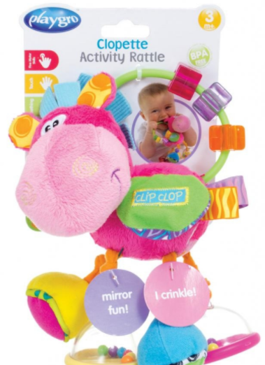 此次召回產(chǎn)品為Playgro的Clip Clop撥浪鼓玩具。產(chǎn)品為藍色毛絨小馬造型,四條腿中2條作為撥浪鼓、1條腿上有鏡子,馬背上有算盤和3顆珠子。側(cè)面標簽上印有“Clip Clop”;縫合處的標簽上印有批號010053、010082;產(chǎn)品包裝上印有UPC 9321104011459。