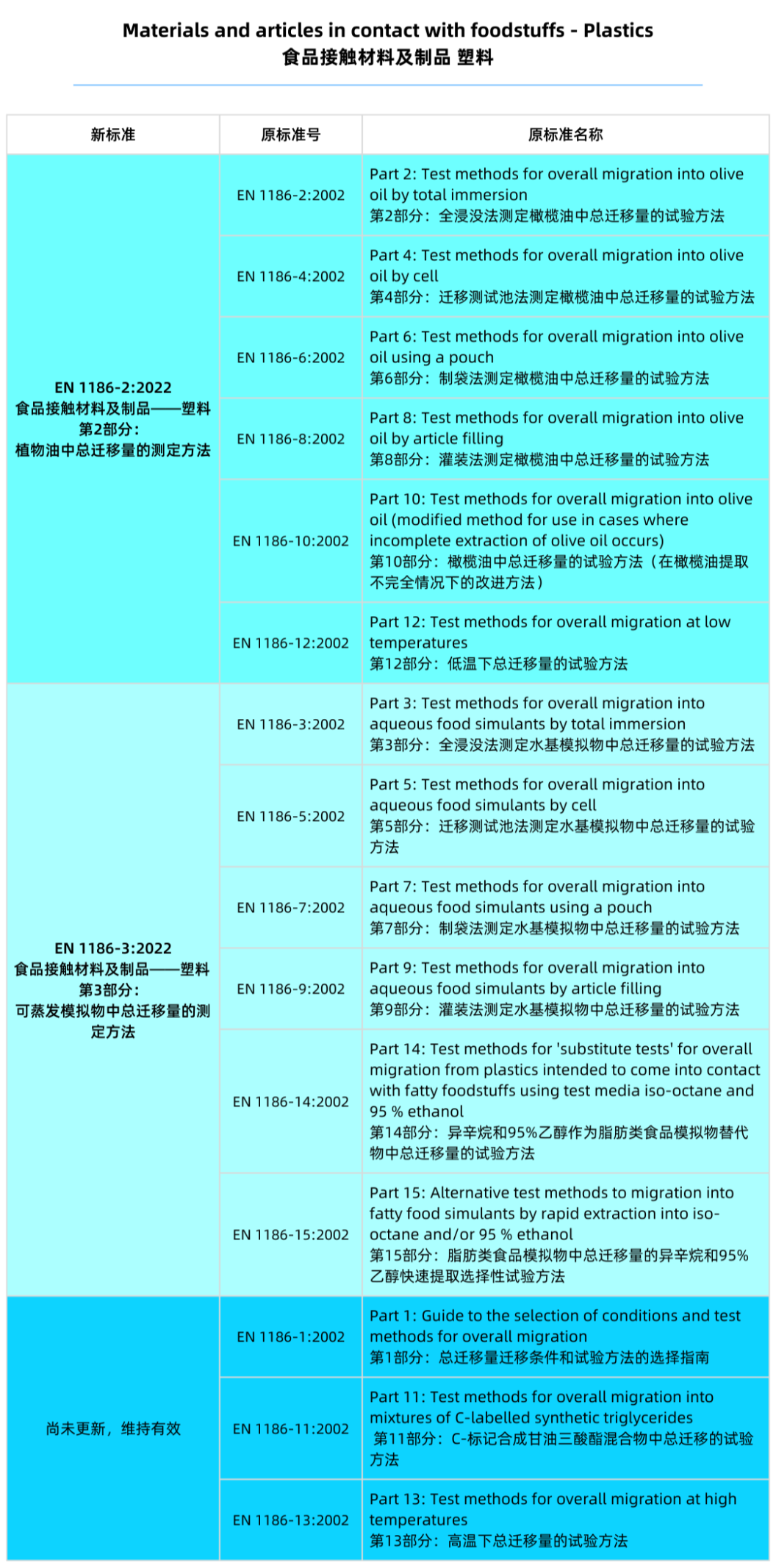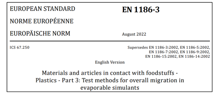 新版EN 1186-3:2022:將測試“水基模擬物及替代溶劑中總遷移量”的原六項2002版標準EN 1186-3、1186-5、1186-7、1186-9、1186-14和1186-15整合為一個標準。