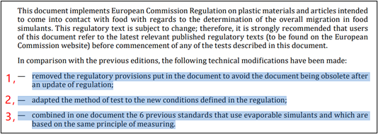 根據(jù)(EU)No. 10/2011及其修正案article 12 第2條及article 17第4條的規(guī)定的新條件,為滿足關(guān)于所有遷移試驗類型測試結(jié)果表達方式的要求,兩項標準都調(diào)整了測試方法,并增加了相應(yīng)的結(jié)果表述。
