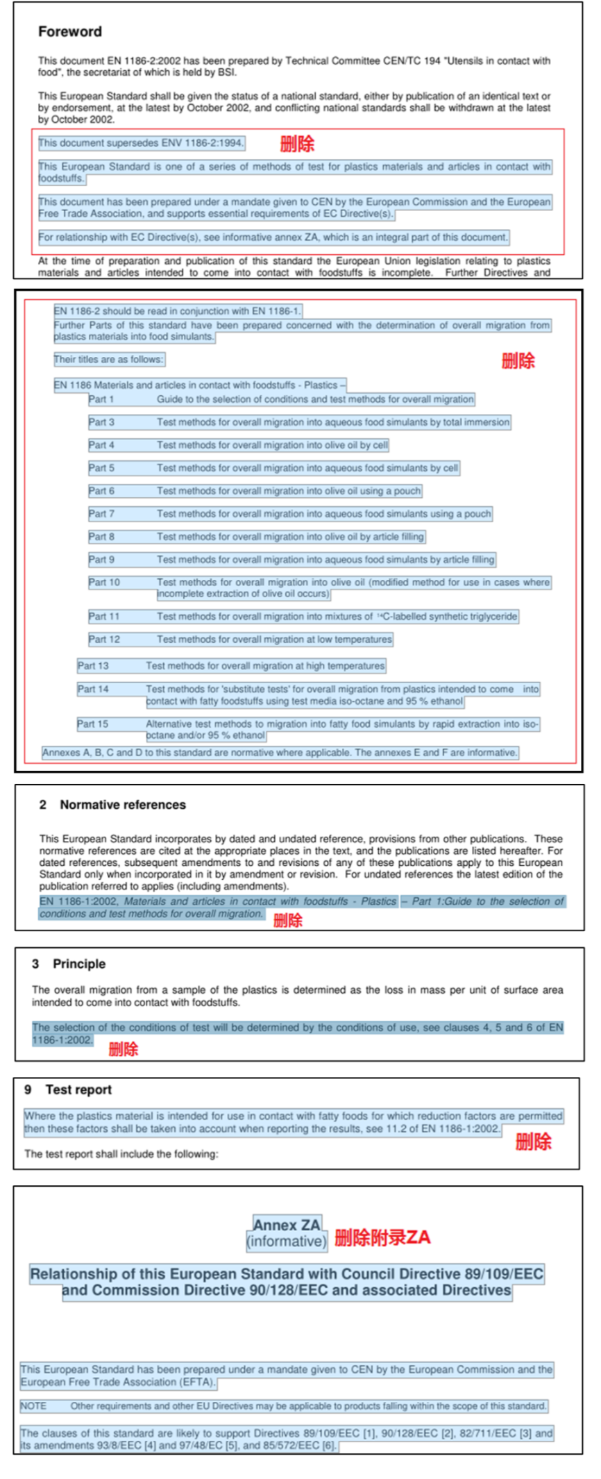 刪除了2002版標準中前言、第二章、第三章及文中測試步驟、測試報告中對EN 1186-1:2002的引用,同時也刪除了原標準附錄ZA及相關(guān)引用,以避免相關(guān)法規(guī)更新后導(dǎo)致標準的失效。