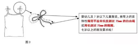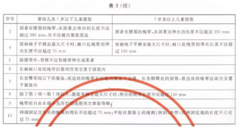 3 | 機(jī)械安全 | 標(biāo)準(zhǔn)對兒童服裝頭頸、肩部、腰部等不同部位繩帶作出詳細(xì)規(guī)定,要求嬰幼兒及7 歲以下兒童服裝頭頸部不允許存在任何繩帶; 標(biāo)準(zhǔn)對紡織附件也做出了規(guī)定,要求附件應(yīng)具有一定的抗拉強(qiáng)力,且不應(yīng)存在銳利尖端和邊緣。 |