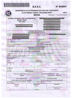 根據(jù)貝寧國法令,凡發(fā)貨至貝寧科托努 (COTONOU) 港或經(jīng)由此港轉往其他目的地的貨物都必須申請電子貨物跟蹤單BESC,BESC全稱為:BORDEREAU DE SUIVI DE CARGAISON。